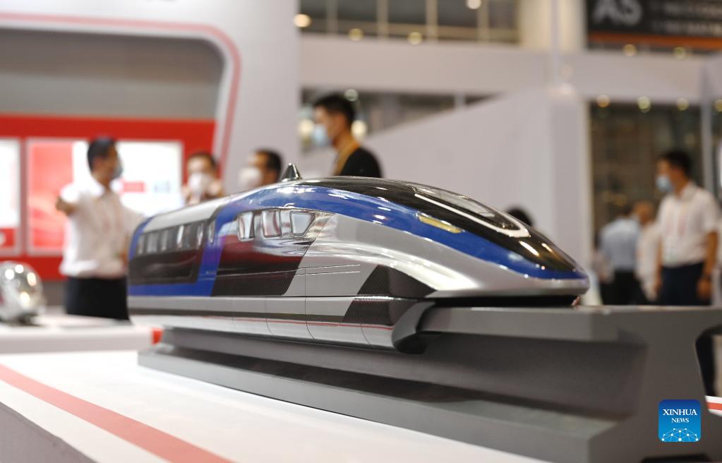Photo taken on Sept. 8, 2021 shows a model of China's self-developed new high-speed maglev transportation system, with a designed top speed of 600 km per hour during an exhibition on BRICS New Industrial Revolution held in Xiamen, southeast China's Fujian Province. An exhibition on BRICS New Industrial Revolution kicked off in Xiamen, a port city in southeast China's Fujian Province on Wednesday. The exhibition covers an area of 10,000 square meters. BRICS is the acronym for an emerging-market bloc that groups Brazil, Russia, India, China and South Africa. (Xinhua/Lin Shanchuan)