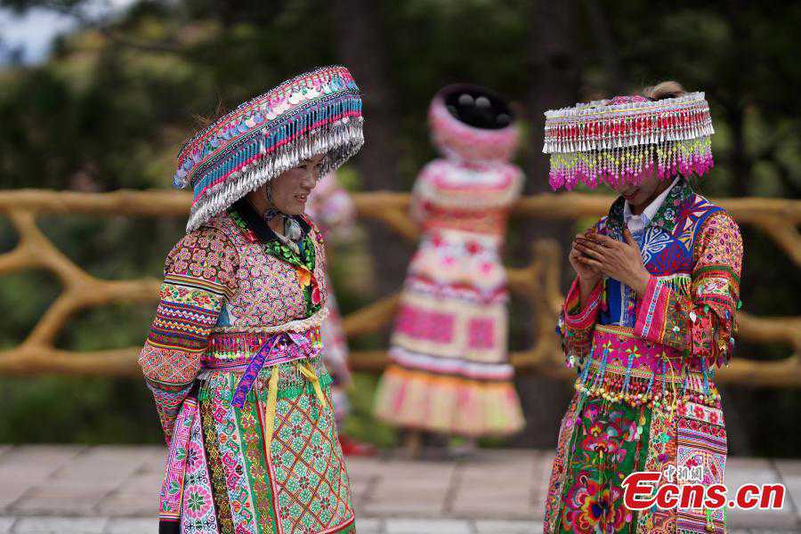 Miao women dance "Gameng Kadou" at a square in Yongping, Southwest China's Yunnan Province, Sept. 7, 2021. "Gameng Kadou," the dance with a history of more than 1,800 years, is a transliteration of the Miao language. The music accompanied by Lusheng, a reed-pipe wind instrument, comes from the original music elements of the Miao people. (Photo: China News Service/Kang Ping)