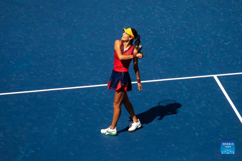 Emma Raducanu of the Great Britain reacts after winning the women's singles quarterfinals of the 2021 US Open against Belinda Bencic of Switzerland in New York, the United States on Sept. 8, 2021. (Photo by Michael Nagle/Xinhua)