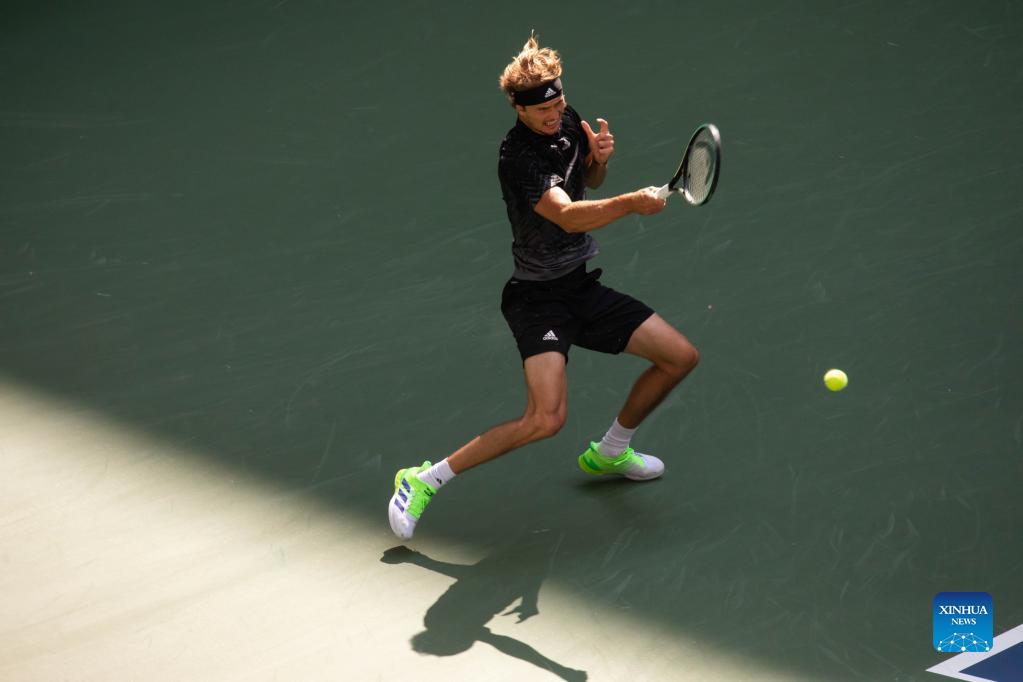 Alexander Zverev of Germany hits a return during the men's singles quarterfinals of the 2021 US Open against Lloyd Harris of South Africa in New York, the United States on Sept. 8, 2021. (Photo by Michael Nagle/Xinhua)