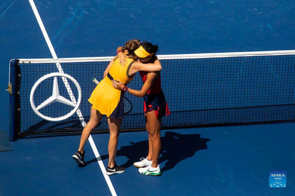 Emma Raducanu (R) of the Great Britain hugs Belinda Bencic of Switzerland after their women's singles quarterfinals of the 2021 US Open in New York, the United States on Sept. 8, 2021. (Photo by Michael Nagle/Xinhua)