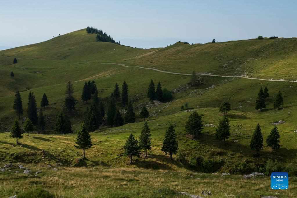 Photo taken on Sept. 8, 2021 shows a view of the Velika planina, Kamnik, Slovenia. Velika planina, a large Alpine settlement of shepherds in Europe, is a tourist destination on the Alpine pastures in Slovenia. (Photo by Zeljko Stevanic/Xinhua)