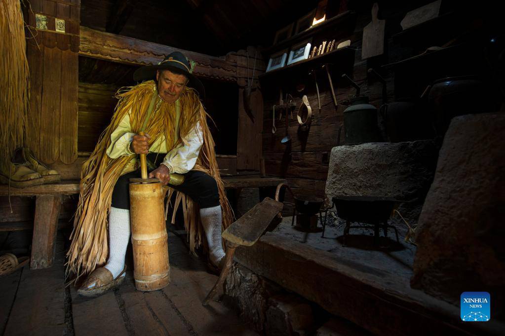 Shepherd Peter Erjavsek demonstrates the traditional method of making yogurt in Velika planina, Kamnik, Slovenia, Sept. 8, 2021. Velika planina, a large Alpine settlement of shepherds in Europe, is a tourist destination on the Alpine pastures in Slovenia. (Photo by Zeljko Stevanic/Xinhua)