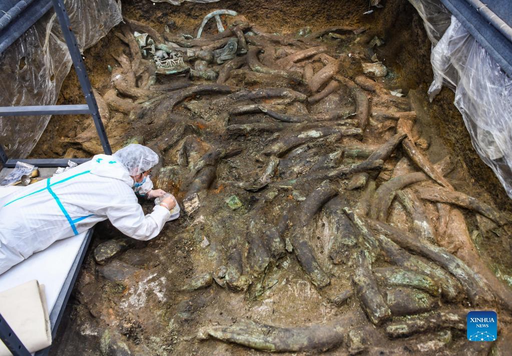 An archaeologist works at the No. 8 sacrificial pit of the Sanxingdui Ruins site in southwest China's Sichuan Province, Sept. 2, 2021. More than 500 pieces of relics have been discovered in recent months at the legendary Sanxingdui Ruins site, dazzling archaeologists with their historical value as well as the display of creativity and ingenuity. (Xinhua/Wang Xi)