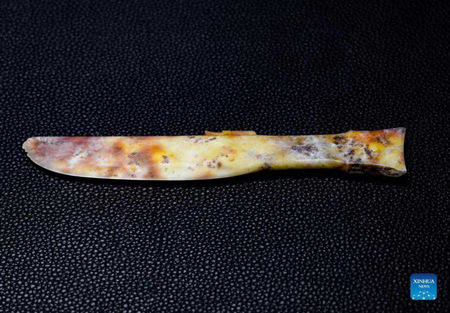 Photo taken on Sept. 3, 2021 shows a jade knife discovered at the No. 6 sacrificial pit of the Sanxingdui Ruins site in southwest China's Sichuan Province. More than 500 pieces of relics have been discovered in recent months at the legendary Sanxingdui Ruins site, dazzling archaeologists with their historical value as well as the display of creativity and ingenuity. (Xinhua/Wang Xi)