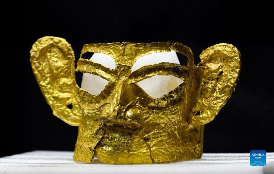 Photo taken on Sept. 2, 2021 shows a golden mask discovered at the No. 3 sacrificial pit of the Sanxingdui Ruins site in southwest China's Sichuan Province. More than 500 pieces of relics have been discovered in recent months at the legendary Sanxingdui Ruins site, dazzling archaeologists with their historical value as well as the display of creativity and ingenuity. (Xinhua/Wang Xi)
