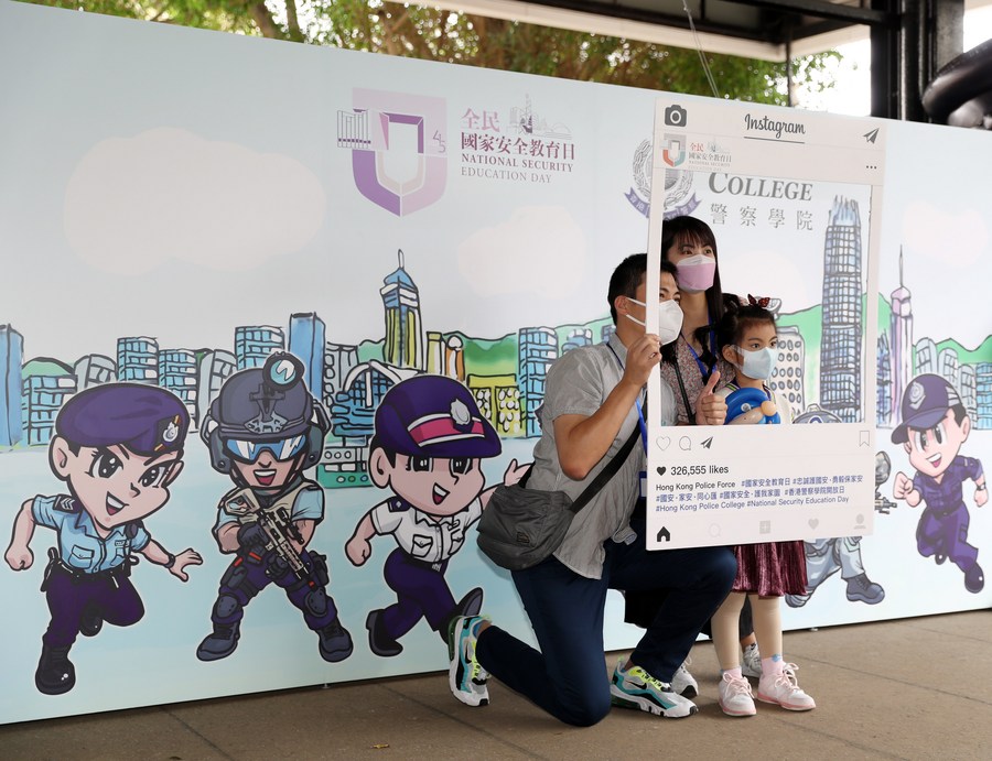 Citizens pose for a photo during an activity themed on National Security Education Day at the Hong Kong Police College in south China's Hong Kong, on April 15, 2021. (Xinhua/Li Gang)