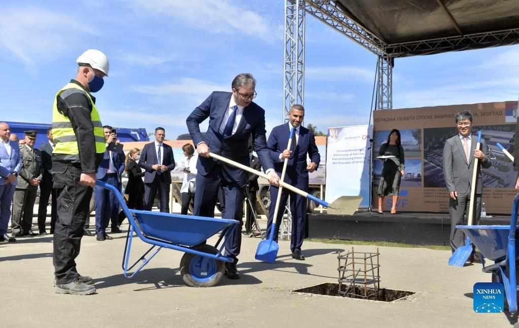 Serbian President Aleksandar Vucic (C) attends the ceremony of laying the foundation stone for a COVID-19 vaccine production factory in Belgrade, Serbia, on Sept. 9, 2021. Construction of the first Chinese COVID-19 vaccine production facility in Europe started in Serbia on Thursday. (Photo by Predrag Milosavljevic/Xinhua)