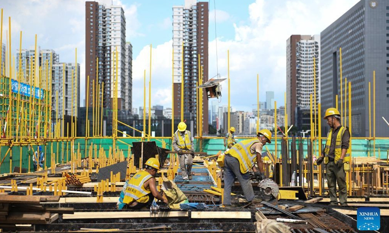 Workers operate at the construction site for a transaction center in Qianhai, Shenzhen City, south China's Guangdong Province, on Sept. 8, 2021.Photo:Xinhua