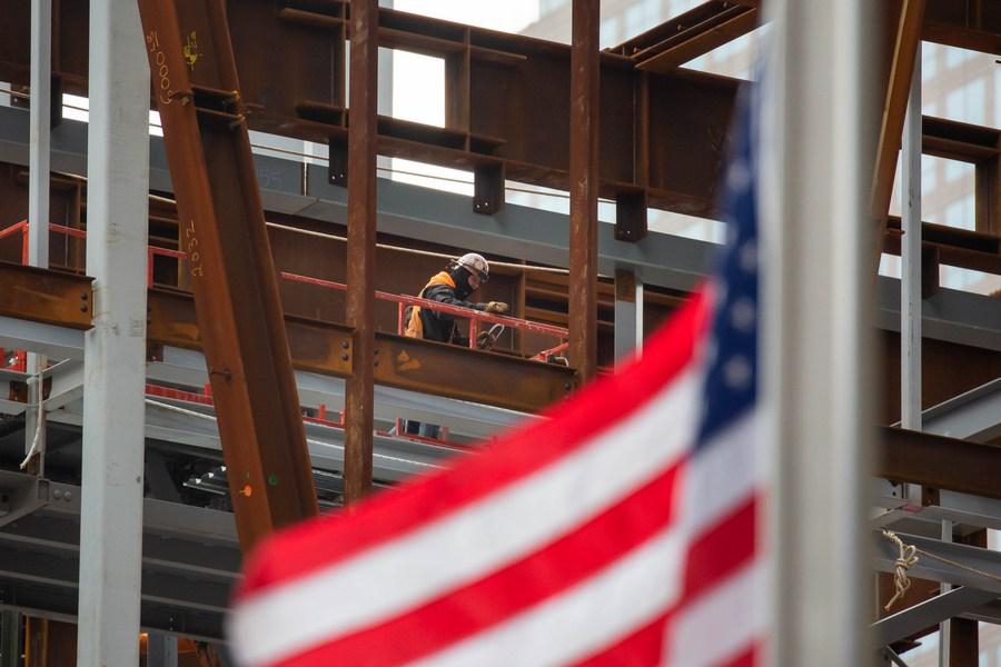 A construction worker works at the Ronald O. Perelman Performing Arts Center at the World Trade Center construction site, in New York, United States, Jan. 8, 2021.(Photo by Michael Nagle/Xinhua)