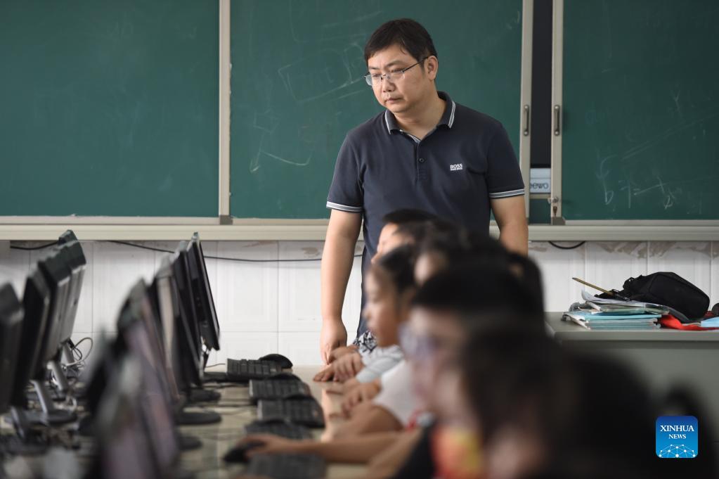 Yang Sen gives a computer class at Heping Primary School in Hefei City, east China's Anhui Province, Sept. 8, 2021. Yang Sen, a computer teacher from Heping Primary School, has interest in graphical language applied to robots in his spare time. After class, he organizes a robot club instructing his students to explore the use of multiple sensors and various scientific principles. (Xinhua/Zhou Mu)
