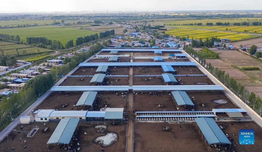 Aerial photo taken on Sept. 8, 2021 shows the view of a cow breeding farm in Shajiang Village of Lingwu City, northwest China's Ningxia Hui Autonomous Region, Sept. 8, 2021. (Xinhua/Yang Zhisen)