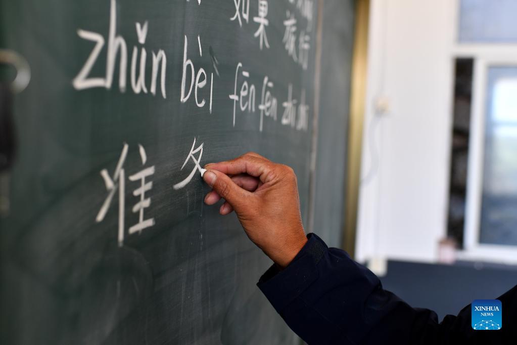Song Zhongsheng teaches Chinese at Datuo teaching site in Datuo Village, Pingshun County, Changzhi City of north China's Shanxi Province, Sept. 8, 2021. Nestled deeply in the Taihang Mountain at an elevation of 1,600 meters in Pingshun County, the Datuo teaching site is the only educational facility within 10 kilometers reach. Song Zhongsheng and his wife Li Yuemei, the only faculty at the site, have been working there for 16 years in a row, currently rendering their services to merely five students of varying ages. A perfect team of two, Song is responsible for classes of Chinese, political science, and physical education, as Li takes on mathematics, painting, and music. More often than not, they need to walk some of their students' home after a full day's work at site. "Education is a life changer. We are willing to devote our time here, serving as a bridge for these kids to walk out of the mountain." (Xinhua/Zhan Yan)