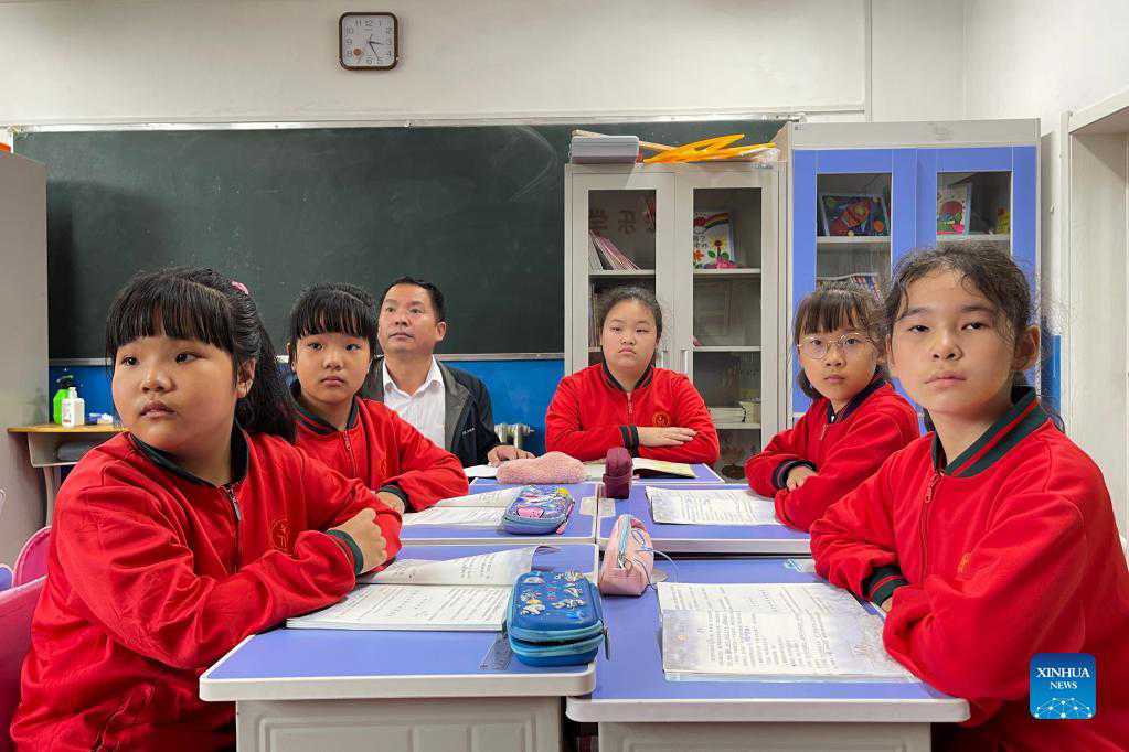 Photo taken with a mobile phone on Sept. 6, 2021 shows Ma Jianguo attending class with students at Beiji central school in Beiji Village of Mohe City, northeast China's Heilongjiang Province. Ma Jianguo is the principal of Beiji central school in Beiji Village, also known as the arctic village. In 1997, Ma came to Mohe and became a village teacher after graduating from university. When he first came here, the school was lack of teachers. Thus, Ma has taught different subjects since then. Over the years, a lot of teachers have left the school, but Ma stayed because he believed underprivileged students need good teachers more. Since 2013, Ma has served as the principal of the school. The number of students has increased from the least 120 to more than 160. (Xinhua/Yang Siqi)