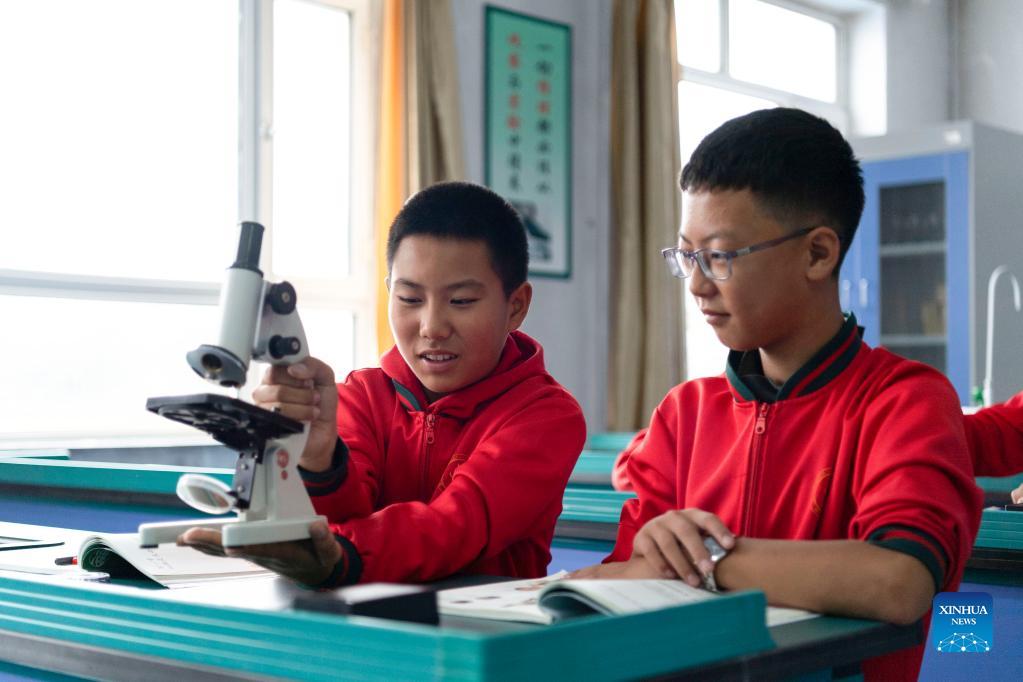 Students take biology class at Beiji central school in Beiji Village of Mohe City, northeast China's Heilongjiang Province, Sept. 7, 2021. Ma Jianguo is the principal of Beiji central school in Beiji Village, also known as the arctic village. In 1997, Ma came to Mohe and became a village teacher after graduating from university. When he first came here, the school was lack of teachers. Thus, Ma has taught different subjects since then. Over the years, a lot of teachers have left the school, but Ma stayed because he believed underprivileged students need good teachers more. Since 2013, Ma has served as the principal of the school. The number of students has increased from the least 120 to more than 160. (Xinhua/Xie Jianfei)