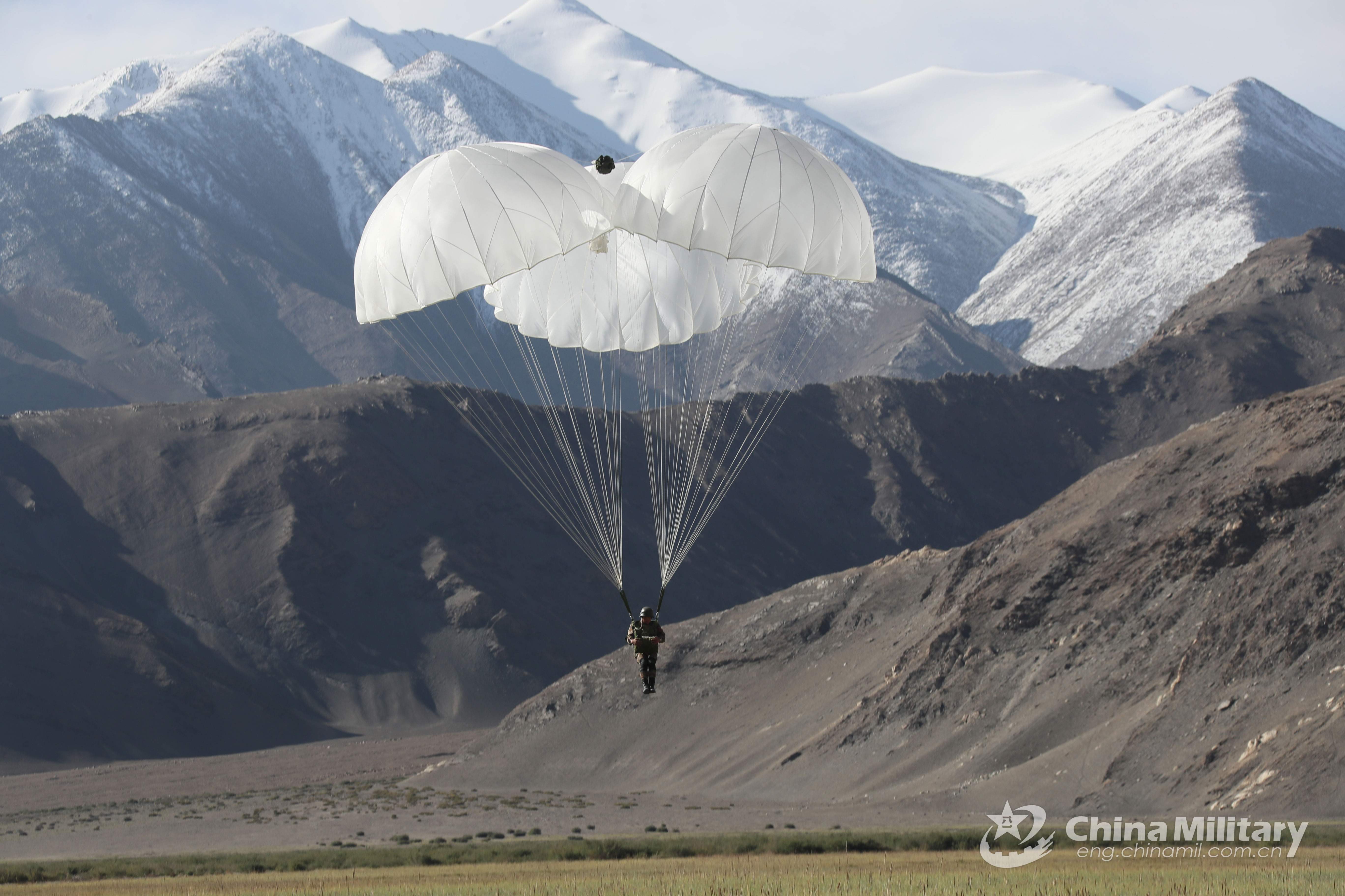 A paratrooper assigned to a special operations brigade under the PLA Xinjiang Military Command controls his parachute to reach the drop zone during a parachuting training exercise on August 31, 2021. This exercise effectively beefed up the troops' operation skills in plateau area. (eng.chinamil.com.cn/Photo by Shan Chuangyang)