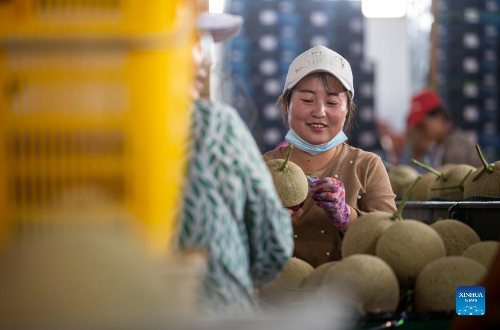 Farmers pack cantaloupes at a cantaloupe farm in Lingwu, northwest China's Ningxia Hui Autonomous Region, Sept. 8, 2021. (Xinhua/Yang Zhisen)