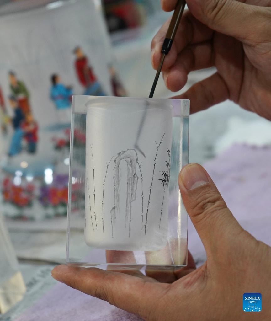 Wang Ziyong creates inside painting works at a museum featuring inside paintings in Taocheng District of Hengshui City, north China's Hebei Province, Sept. 4, 2021. Inside painting, or inner painting, is a traditional Chinese art form. It originally involves tiny snuff bottles which have pictures and calligraphy painted on the inside surface of the bottle. Snuff bottle paintings are produced by manipulating a specialized brush through the neck of the bottle. The process of painting, which is totally reversed inside the bottle, requires absolute precision from the artist. Wang Ziyong, 52, an inside painting craftsman, studied inside painting with his father Wang Ruicheng since childhood. After graduating from college, Wang returned to Hengshui City and devoted himself to the artwork. Thanks to years of practice, he quickly developed his own style. In order to better paint the color highlights and handle details, Wang developed a new type of brush, which improved the drawing efficiency. He also developed different styles to create inside painting, not only inside snuff bottles, but also inside pencil vases, crystal balls, tea sets and folding screens. In 1995, he gave up the traditional workshop-style production mode of inside painting and established a modern enterprise, integrating development, design, production, processing and sales of the artwork. In 2003, with the help of his father, Wang founded a museum in Hebei themed on inside paintings, showing the historical development and creative process of the art. In 2006, inside painting was added to the list of national intangible cultural heritages. In 2012, Wang Ziyong was named the inheritor of provincial intangible cultural heritage projects. During all these years, Wang has won many prizes with his innovative artwork, and offered training to 38 apprentices, trying to make this traditional skill shine a new light. "I hope more people can feel the charm of Hengshui inside painting in the future," Wang said. (Xinhua/Jin Haoyuan)