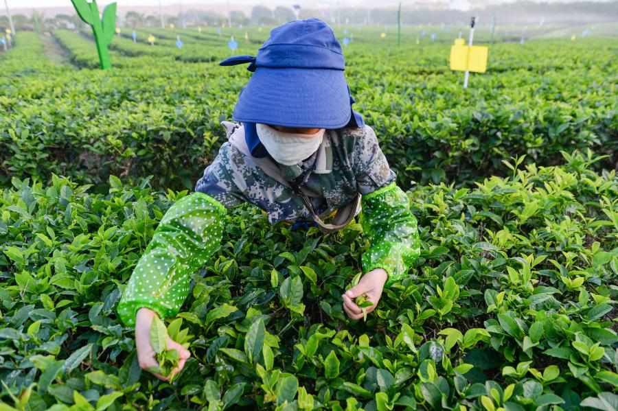 A farmer picks tea leaves at a tea garden in Baisha Li Autonomous County in south China's Hainan Province, Feb. 7, 2021. (Xinhua/Zhou Jiayi)