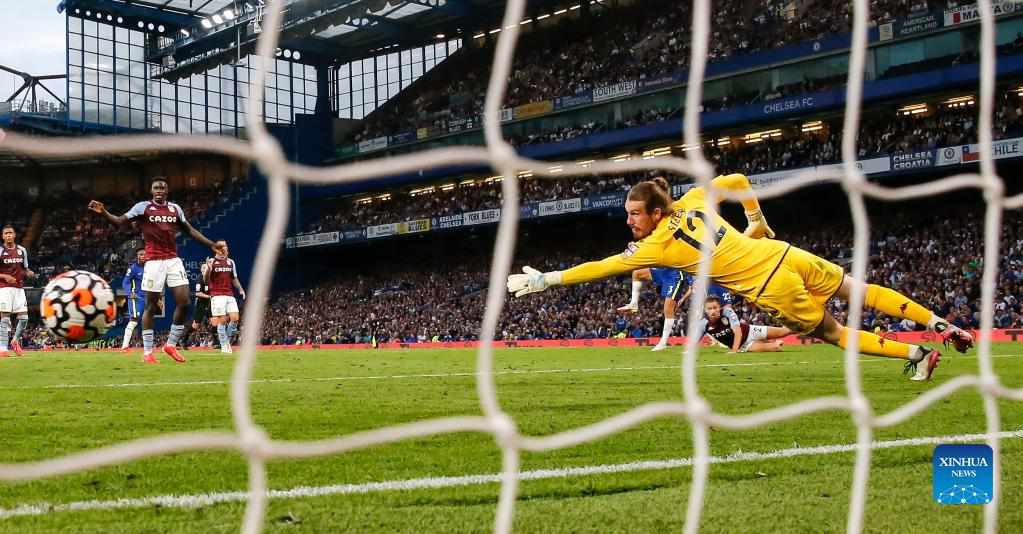 Aston Villa's goalkeeper Jed Steer (Front, R) dives to save the ball during the Premier League match between Chelsea and Aston Villa in London, Britain, on Sept. 11, 2021. (Xinhua/Han Yan)