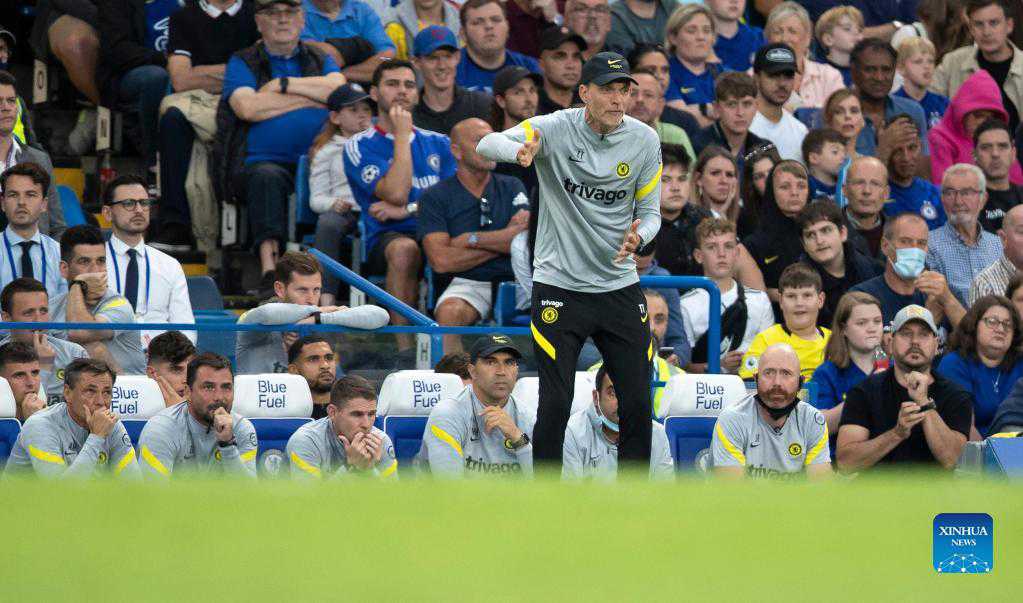 Chelsea's manager Thomas Tuchel reacts during the Premier League match between Chelsea and Aston Villa in London, Britain, on Sept. 11, 2021. (Xinhua/Han Yan)
