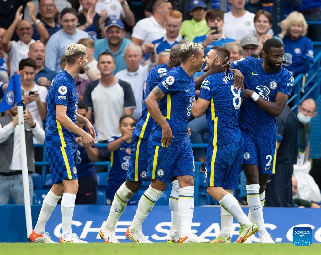 Chelsea's players celebrate the team's second goal by Mateo Kovacic (2nd R) during the Premier League match between Chelsea and Aston Villa in London, Britain, on Sept. 11, 2021. (Xinhua/Han Yan)