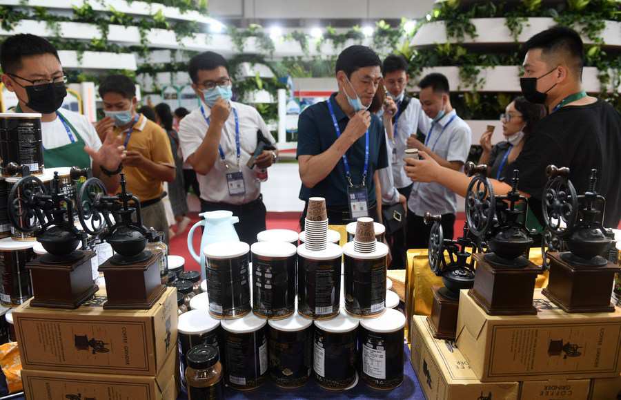 Visitors try out coffee products from ASEAN countries at the 18th China-ASEAN Expo in Nanning, capital of south China's Guangxi Zhuang Autonomous Region, Sept. 10, 2021. (Xinhua/Lu Boan)