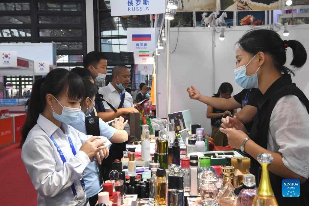 A visitor tries Russian perfume during the 18th China-ASEAN Expo in Nanning, capital of south China's Guangxi Zhuang Autonomous Region, Sept. 12, 2021. The 18th China-ASEAN Expo and China-ASEAN Business and Investment Summit kicked off Friday in Nanning, highlighting the building of a closer China-ASEAN community with a shared future. This year's expo continues to set "Belt and Road" International Pavilion for countries outside ASEAN, with about 120 enterprises from 30 countries participating in the expo. (Xinhua/Zhou Hua)