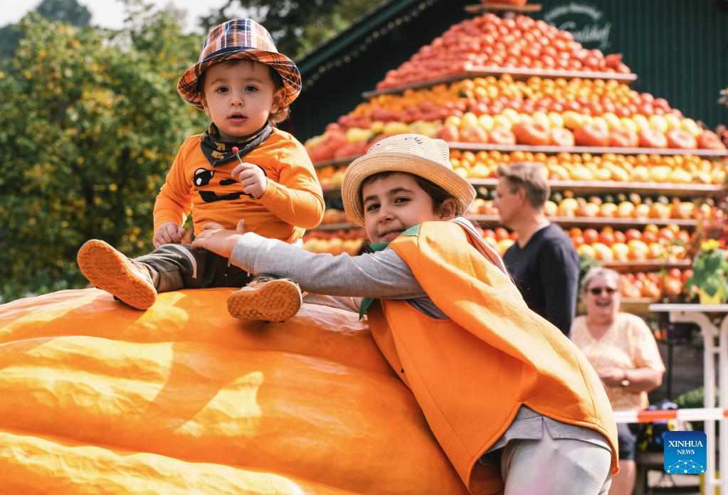 Children pose for a photo on a giant pumpkin during a traditional pumpkin festival in Lohmar, a town near Cologne, Germany, on Sept. 12, 2021. (Photo by Tang Ying/Xinhua)