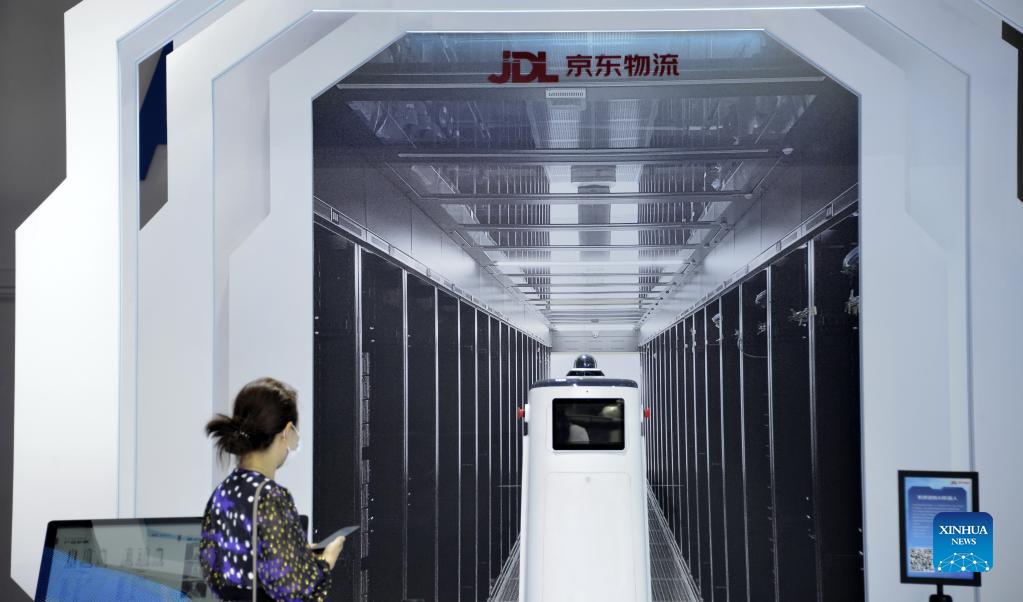 Photo taken on Sept. 12, 2021 shows an intelligent delivery robot displayed at the World Robot Conference held in Beijing, capital of China. The 2021 World Robot Conference is held in Beijing from Sept. 10 to 13. More than 110 enterprises and scientific research institutions brought over 500 products to the exhibition. (Xinhua/Li Xin)