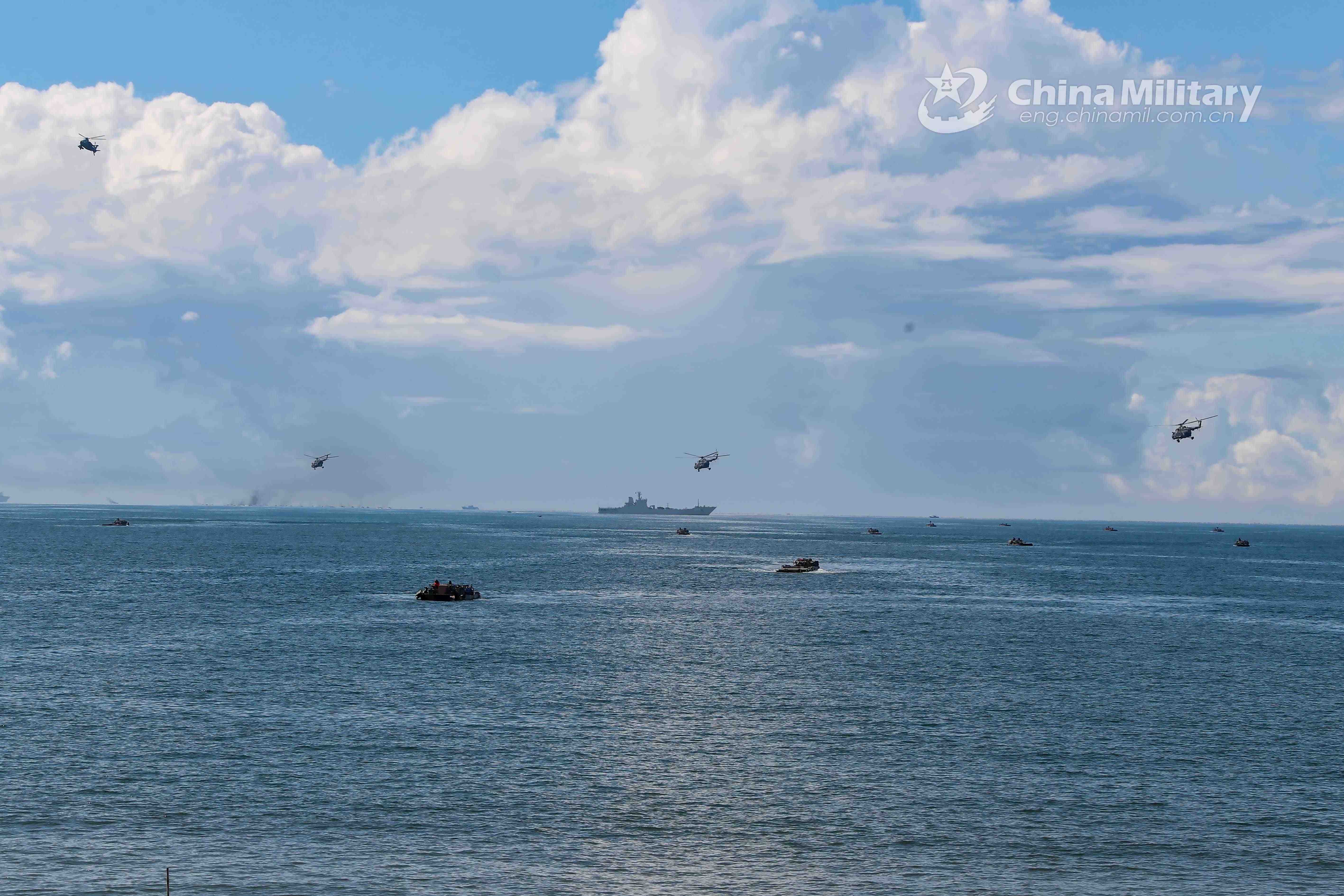 The military helicopters and amphibious assault vehicles attached to a brigade of the army under the PLA Eastern Theater Command conduct coordination in a maritime training exercise on September 4, 2021. (eng.chinamil.com.cn/Photo by Xie Wenjian)
