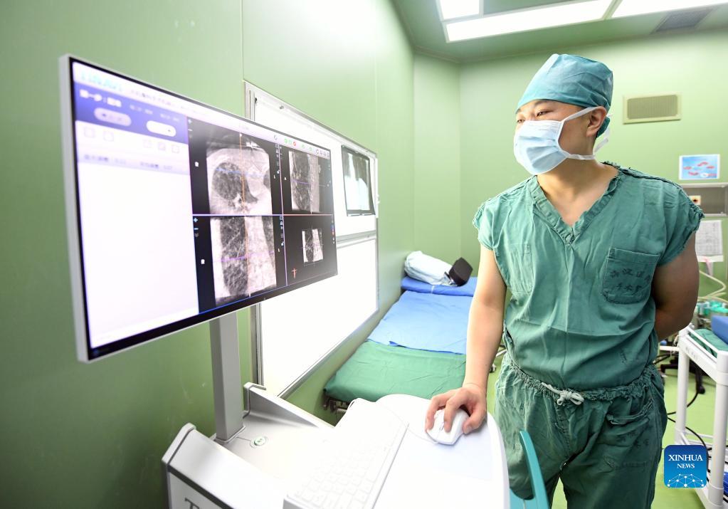 A doctor makes a surgical plan to be carried out by orthopedic surgical robot in Haidian Hospital in Beijing, capital of China, Aug. 3, 2021. The orthopedic surgical robot could dynamically analyze the patient's anatomy as well as the spine-hip relation and carry out the individualized surgery planning exactly as planned. Beijing Haidian Hospital officially introduced orthopedic surgery robots from May 2020, and has completed more than 400 robotic surgeries by the end of August 2021. (Xinhua/Ren Chao)