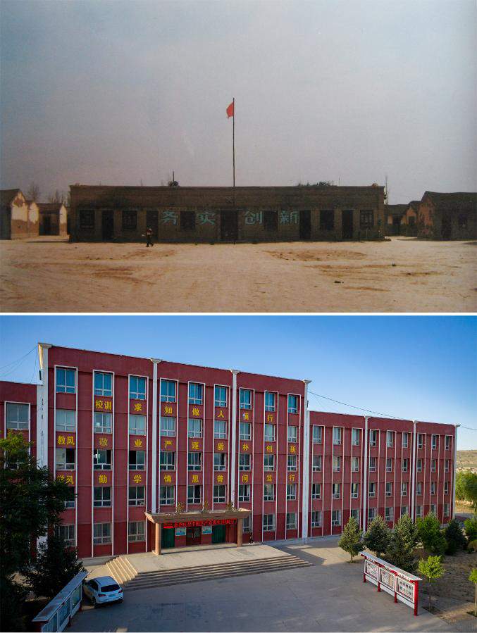 Combo photo shows the offices and meeting rooms of Tongxin No. 3 Middle School in March 2000 (top, file photo) and aerial view of the teaching building of Tongxin No. 3 Middle School on June 21, 2021 (bottom, taken by Yang Zhisen), in Yuwang Township of Tongxin County, northwest China's Ningxia Hui Autonomous Region. (Xinhua)