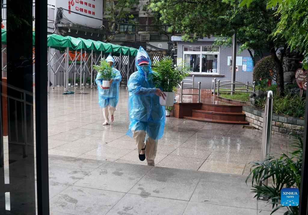 Staff members carry pot plants indoor at a primary school in Huangpu District, east China's Shanghai, Sept. 13, 2021. Shanghai has ordered kindergartens, primary and high schools to suspend classes from Monday afternoon to Tuesday as the city braces for heavy rains and strong winds due to Typhoon Chanthu. (Xinhua/Liu Ying)