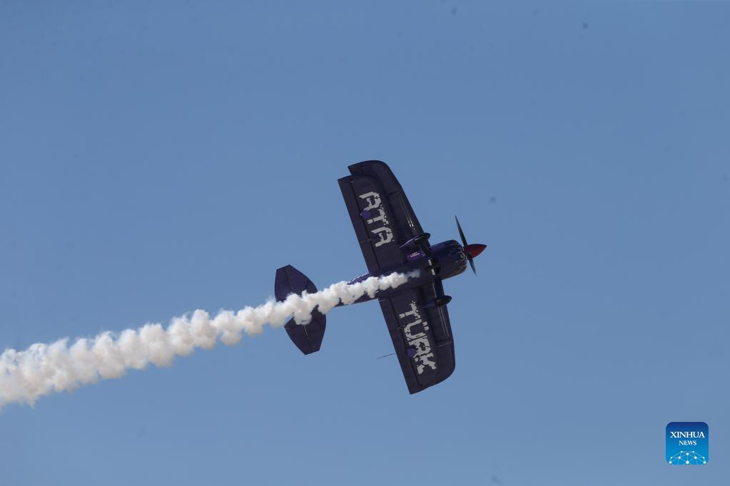 An aircraft performs during the Sivrihisar Airshow 2021 in Sivrihisar district of Eskisehir in Turkey, on Sept. 12, 2021. The Sivrihisar Airshow, which is organized annually by Sivrihisar Sportive Aviation Society, kicked off here on Sunday. (Photo by Mustafa Kaya/Xinhua)