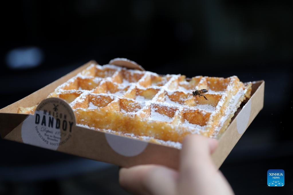 A bee is attracted by a Belgian Waffle in central Brussels, Belgium, Sept. 10, 2021. (Xinhua/Zheng Huansong)