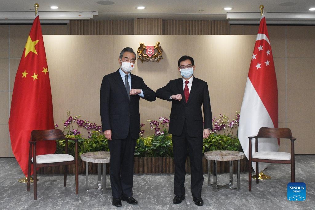 The pledge was made during a meeting between visiting Chinese State Councilor and Foreign Minister Wang Yi and Singapore's Deputy Prime Minister Heng Swee Keat.