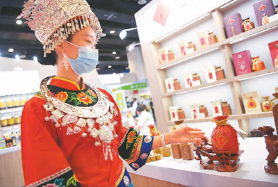 An exhibitor from central China’s Hunan province advertises products at the 18th China-ASEAN Expo in Nanning, capital of south China’s Guangxi Zhuang Autonomous Region, Sept. 11, 2021. (Xinhua/Ma Ning)