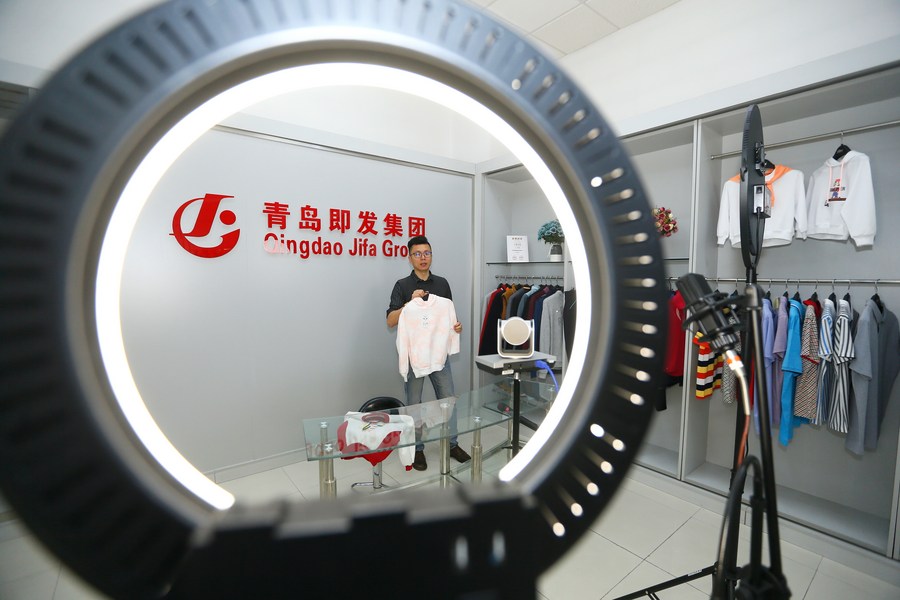 A staff member of Qingdao Jifa Group presents an apparel product via the livestreaming platform of online Canton Fair in Qingdao, east China's Shandong Province, Oct. 15, 2020. (Photo by Liang Xiaopeng/Xinhua)