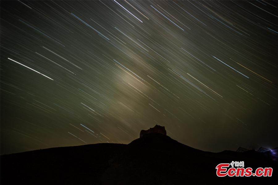 Time-lapse photo shows the starry night sky over the Yangguan Pass in Dunhuang, Northwest China's Gansu Province. (Photo: China News Service/Wang Binyin)
