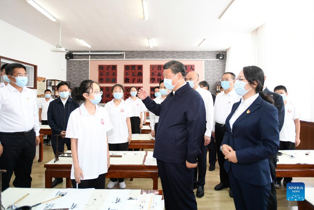 Chinese President Xi Jinping, also general secretary of the Communist Party of China Central Committee and chairman of the Central Military Commission, conducts field research on local efforts in promoting all-round development and healthy growth of students while visiting a middle school in Suide, a county under the city of Yulin in northwest China's Shaanxi Province, Sept. 14, 2021. Xi on Tuesday inspected Suide County. (Xinhua/Li Xueren)