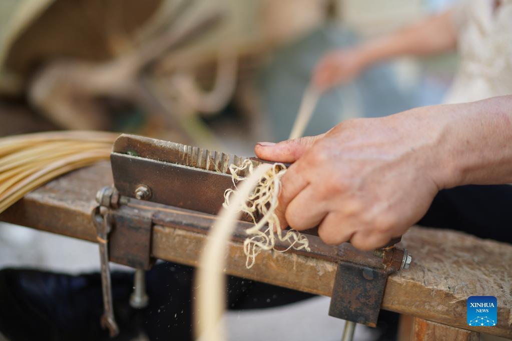 Li Nian'gen prepares raw material for his bamboo products in Dongcun Township, Fenyi County, Xinyu City of east China's Jiangxi Province, Sept. 1, 2021. Li Nian'gen, 62, is the fifth-generation inheritor of bamboo-weaving techniques in Dongcun Township. Li acquired bamboo-weaving techniques from his uncle when he was barely nine years old, and started to make a living on his own at the age of 15. More than 20 of his apprentices chose to seek employment for better income in other walks of life away from home in early 1990s, but Li decided to stay and stick to his profession. Li occasionally demonstrated his bamboo-weaving techniques on a video clip platform as suggested by others in 2019, and became increasingly popular ever since then. Now Li has more than 8 million followers on different platforms, with his short videos popular among netizens. (Xinhua/Zhou Mi)