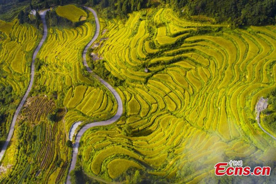 Photo taken in September 2021 shows layers of golden rice paddy and black-and-white Hui-style architecture in the fields create a beautiful harvest scene in Wuyuan, East China's Jiangxi Province. (Photo: China News Service/Zhan Donghua)
