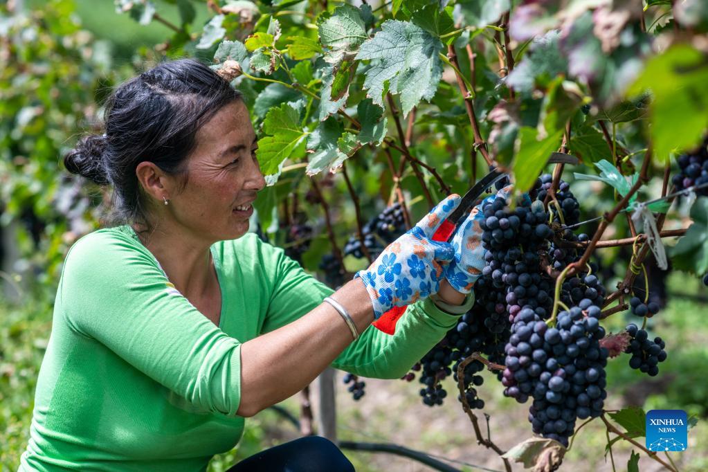 A woman harvests grapes in Deqin County, southwest China's Yunnan Province, Sept. 14, 2021. The grape industry has helped promote the rural development and increase the incomes of the locals. (Xinhua/Hu Chao)