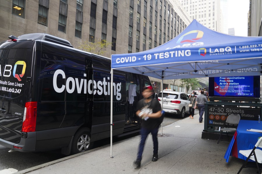 People walk past a mobile COVID-19 testing site on a street in New York, the United States, on July 20, 2021. (Xinhua/Wang Ying)