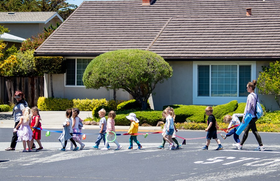 Children go out with their teachers in San Francisco, California, the United States, June 15, 2021. (Photo by Dong Xudong/Xinhua)