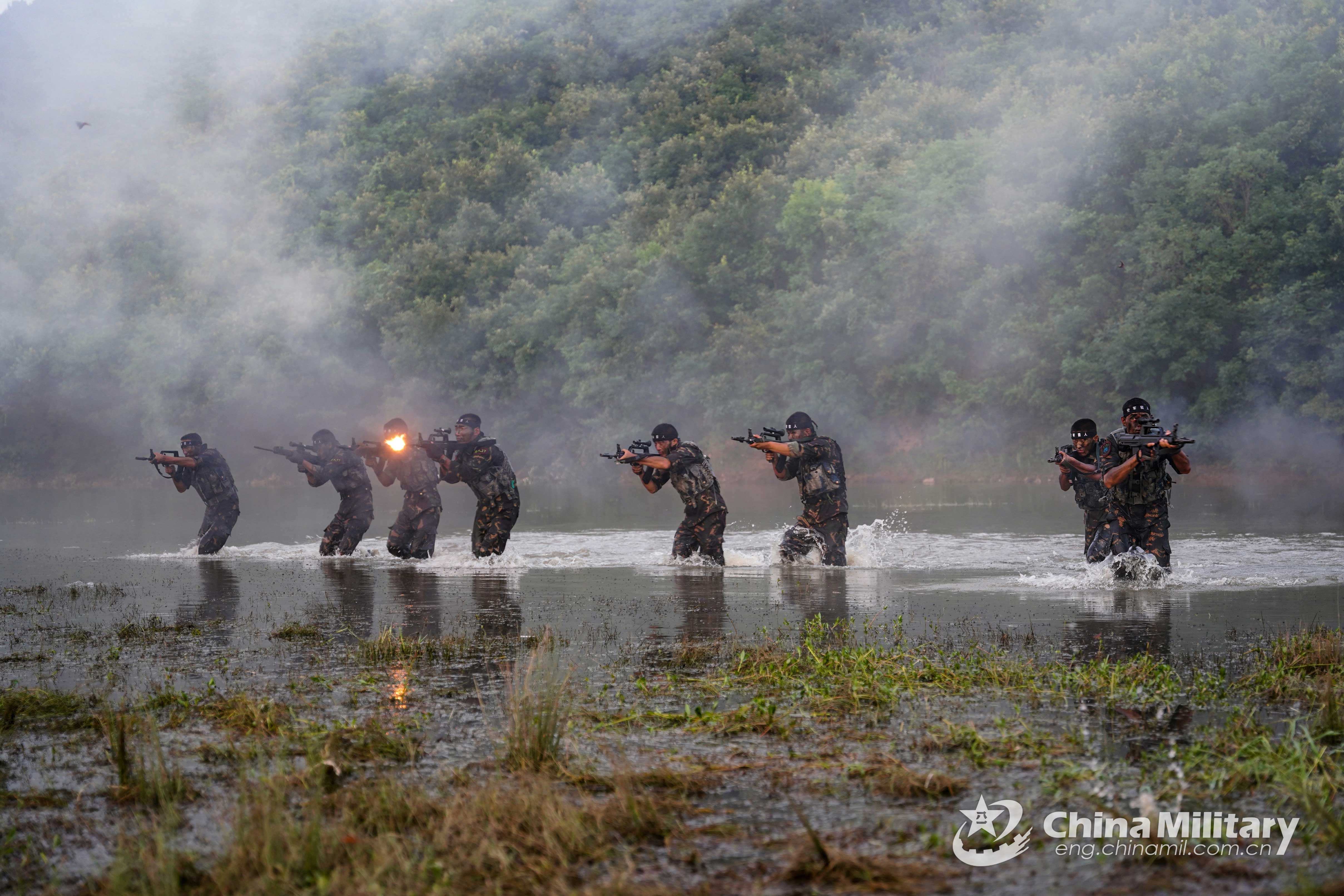 Special operations members assigned to the PLA Air Force conduct closely grouped fire to suppress the enemy during the Hell Week extreme military training in late August. Within the week-long training courses, all the 75 participating members were required to complete 25 training subjects, including loaded march and surviving in the wild. (eng.chinamil.com.cn/Photo by Yang Haofeng)