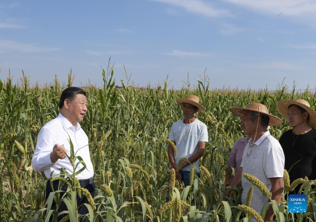 Chinese President Xi Jinping, also general secretary of the Communist Party of China Central Committee and chairman of the Central Military Commission, talks with farmers while visiting Gaoxigou Village in Mizhi County, during his inspection tour of Yulin City in northwest China's Shaanxi Province, Sept. 13, 2021. (Xinhua/Xie Huanchi)