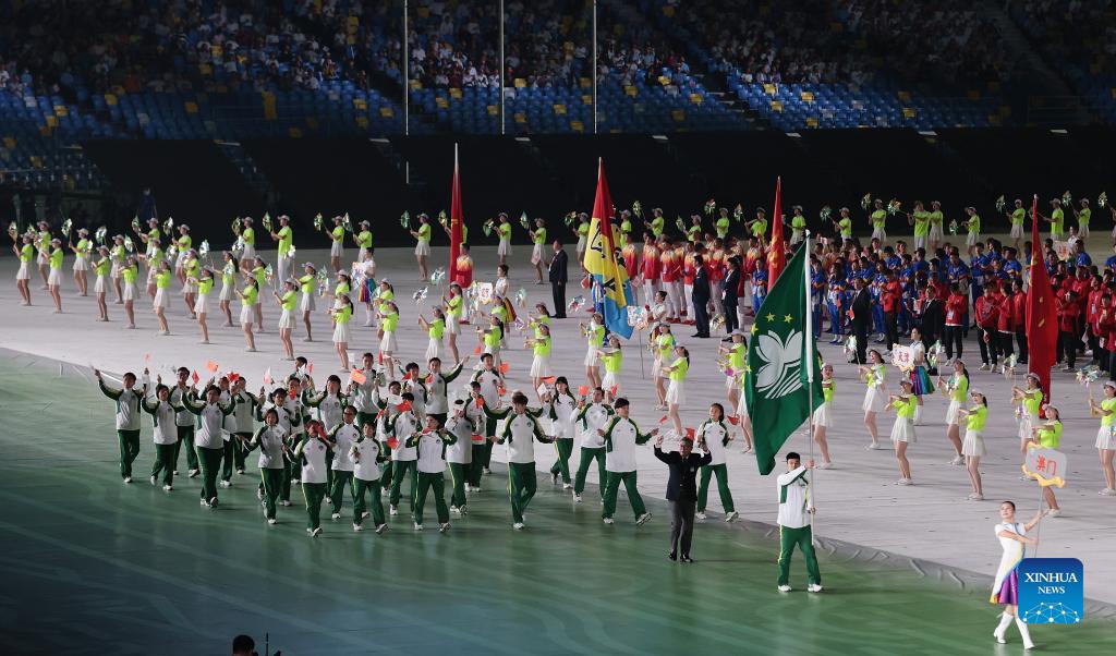 Members of Macao Special Administrative Region Delegation parade into the stadium during the opening ceremony for China's 14th National Games in Xi'an, Shaanxi Province, Sept. 15, 2021. (Xinhua/Xu Yanan)