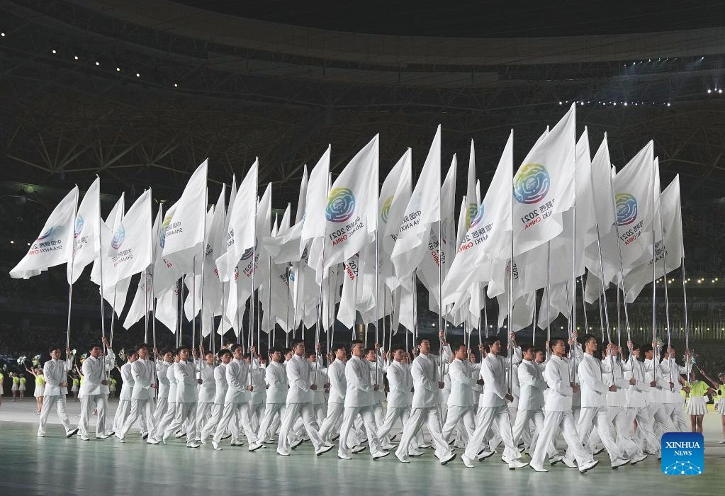 People bearing the flags of China's 14th National Games parade into the stadium during the opening ceremony for the games in Xi'an, Shaanxi Province, Sept. 15, 2021. (Xinhua/Peng Ziyang)